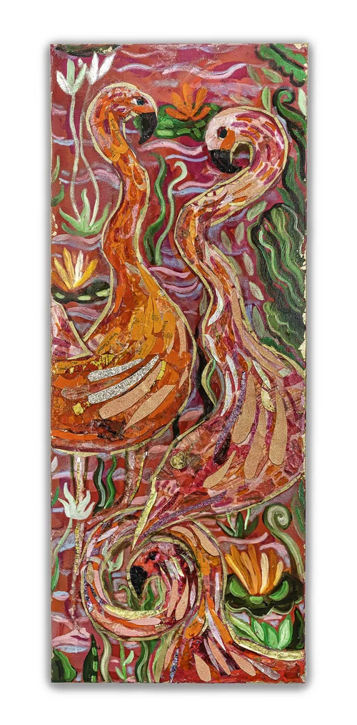 24”H x 36”W, Mixed Media. 2022 I love to collect folk art from Mexico. This tree of life painting/collage is a depiction of a beautiful piece I bought in San Miguel de Allende several years ago. My family and I drove home in our suburban loaded with folk art including my tree of life which was carefully wrapped in bubble wrap . I prayed it would make it home safely along with me and my family. Thankfully we all survived the drive home from San Miguel to San Antonio with out any dents, scratches or missing parts.