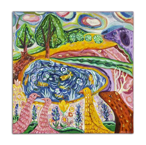 18”H x 24W’, Mixed Media. 2022 I remember being very little and we were at my Godparents family ranch in Refugio, Texas. I was in the main house waiting for everyone to return from the hunt and heard all sort of commotion outside. Mom said that the men dropped her off in a blind with a shotgun never thinking she would hit anything. To their surprise the men folk came to pick her up and she had a bagged a gobbler and a huge javelina that were later barbecued and enjoyed by everyone that evening. They should not have been so surprised. Never underestimate the women in my family. This summer was so unbearably hot that I chose to memorialize that javelina with a hot pink sky in javelina heaven.
